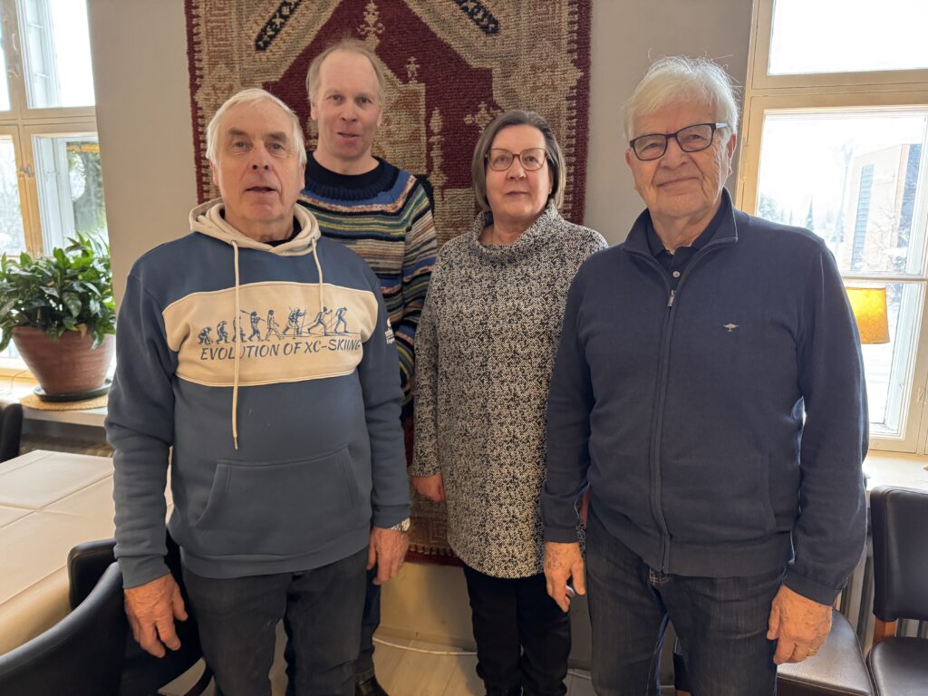 Kuva lehdistötilaisuudesta 3.2.2026, jossa (vas) Kauha-Hiihdon puheenjohtaja Pekka Lammi, pääratamestari Tapio Lintulahti. sihteeri Paula Kallionpää ja tiedottaja Jussi Kleemola.